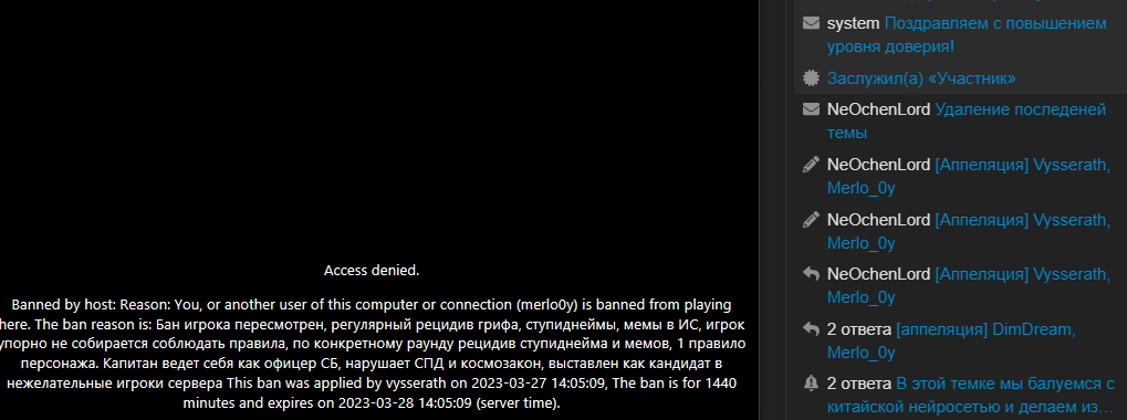 следующее, Мемы в IC: мне уже писали по этому поводу и сделали два предупреждения, почему это надо писать в ризон для бана? когда я уже внятно объяснил что я случайно закопипастил с помощью Window+V.