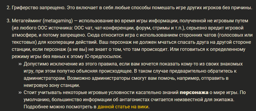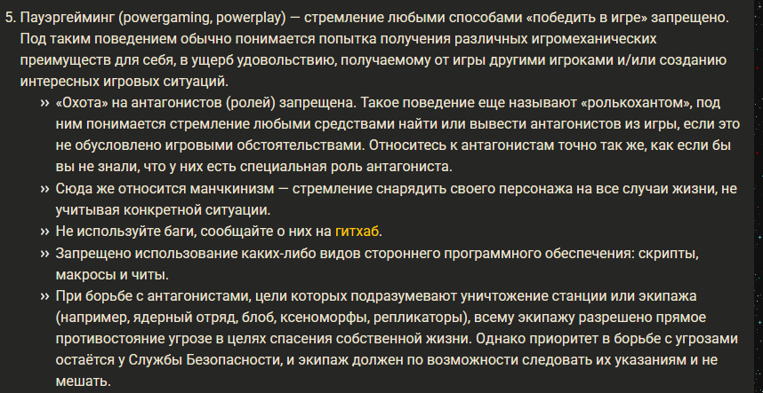 «Охота» на антагонистов (ролей) запрещена. Такое поведение еще называют «ролькохантом», под ним понимается стремление любыми средствами найти или вывести антагонистов из игры, если это не обусловлено игровыми обстоятельствами. Относитесь к антагонистам точно так же, как если бы вы не знали, что у них есть специальная роль антагониста.