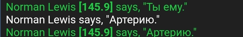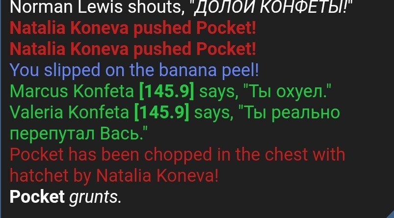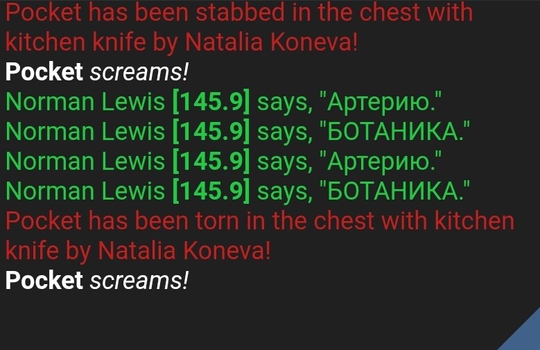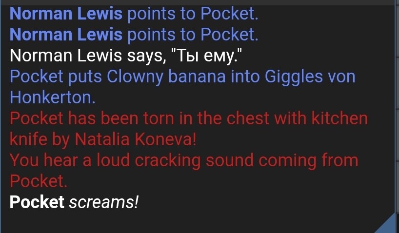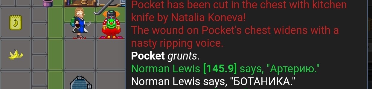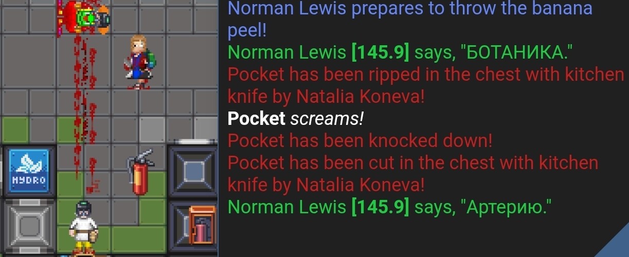 Я (во время раунда был на профессии клоуна) пошёл у ботаников просить бананы. Ботаник попросила в качестве оплаты у меня либо деньги, либо мясо Яна (при этом тритором она не была - проверил в конце раунда). Сказав, что у меня этого нет, я пролез в ботанику, когда она открыла дверь случайно. Я взял бананы, а ботаник начала бить меня топориком. Она вскрыла мне артерию, продолжила бить и после этого. Меня утащили в мед очевидцы, где я и умер.