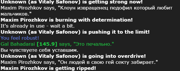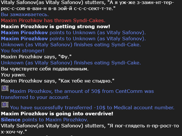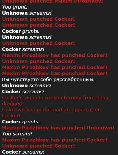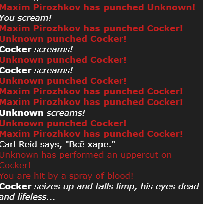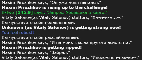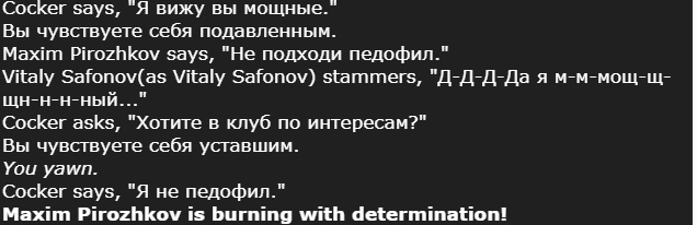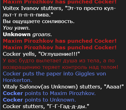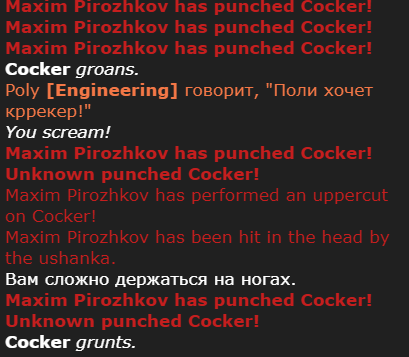 Просматривая за текущей ситуацией и в особенности то что делал один из ассистентов ранее, очень грустно становиться от РП и развития конфликта. В особенности то что клоун никак не нападал на обоих, кроме того что вновь наш первый видел похищение. Но, мы вместо того чтобы сообщить СБ или там крикнуть в общий, что тут у двоих какие-то нимбы (и опять же это больше претензия к Максиму), мы выдаем следующие: Maxim Pirozhkov says, “МОЧИ ПЕДИКОВ.”. А второй подключается и начинает забивать клоуна. Отличный отыгрыш РП. Браво!