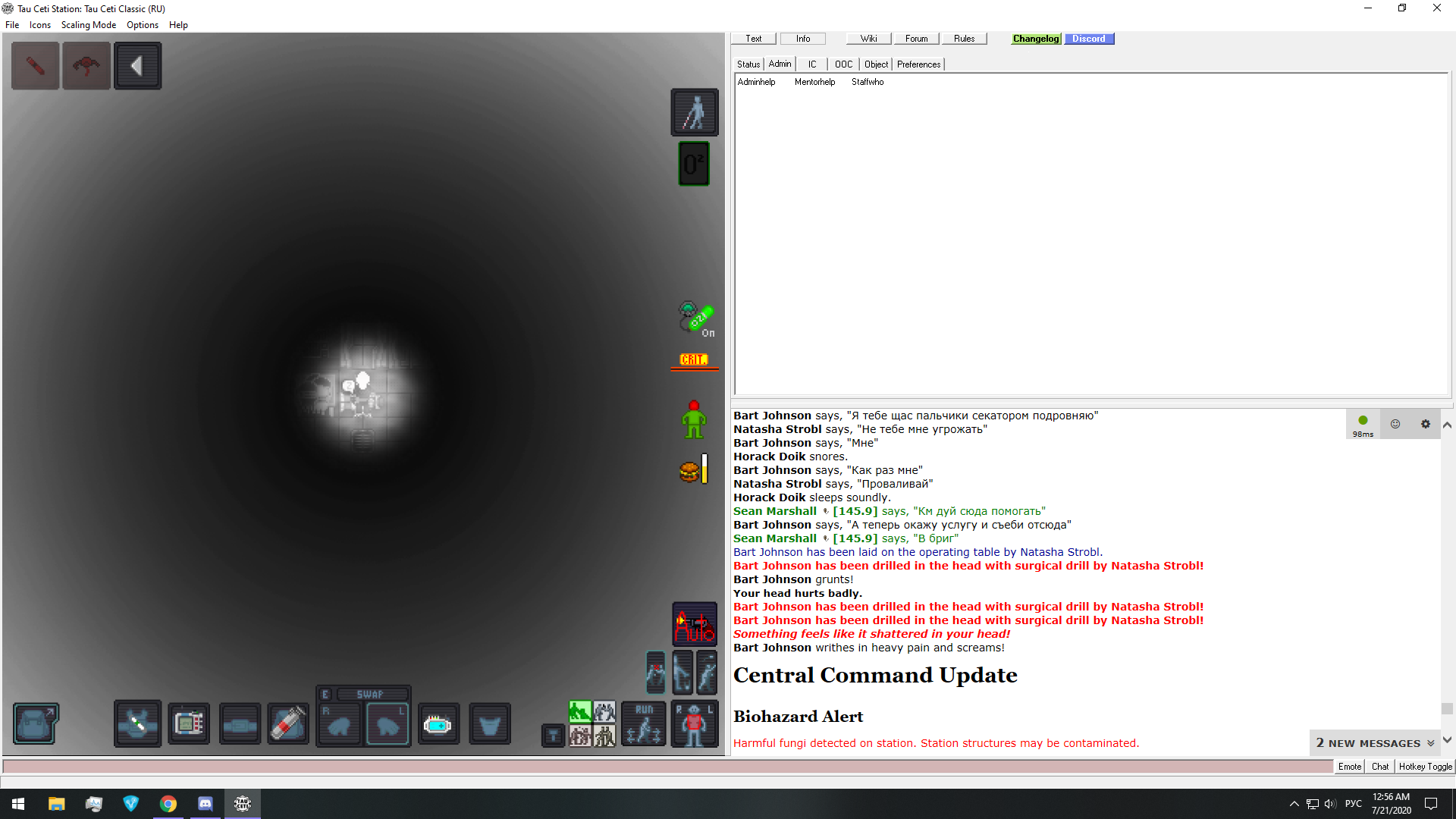 Ситуация была такая. Играю за хирурга, к нам в медбей привезли персонажа с переломом, везу его в операционную (перед этим прождав минут 15, пока она освободится, ибо обе были заняты). Кладу больного на операционный стол, прошу выйти хирурга, который там находился. Сначала вежливо, а потом довольно в грубой форме, но это было эффективно, как я тогда считал. В ответ получаю не менее грубый ответ, а после короткой словесной перепалки ещё и сверлящей дрелью в лицо, таким образом мой перс был доводён до критического состояния.