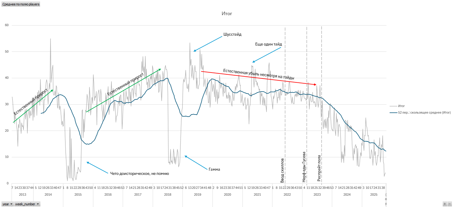 Видно же что нерф еды гусева привёл к пику, а потом к падению, когда “нерф еды” ревертнули через два дня) Ладно, шучу, фиговый ПР был, сейчас бы таких не делал)