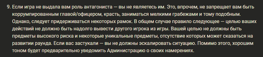 Тут можно долго и много рассуждать о теории ролькоханта, но это не имеет смысла. Люди банально все знают, все особенности режимов, и большинство не может прикидываться незнающими, им не интересно. Но их заставляют, что выливаются в штуки в стиле “ждём пока генка оживет, что резать голову”, “ждём анонсов малфа и ‘удивляемся’ неизвестному хацкеру, отписывая пиздец какие смешные шутки в радио” и тааак далее. В итоге мы имеем быстрый вынос антагов/брига (нужное подчеркнуть) и ожидания нового раунда для повторения событий.
