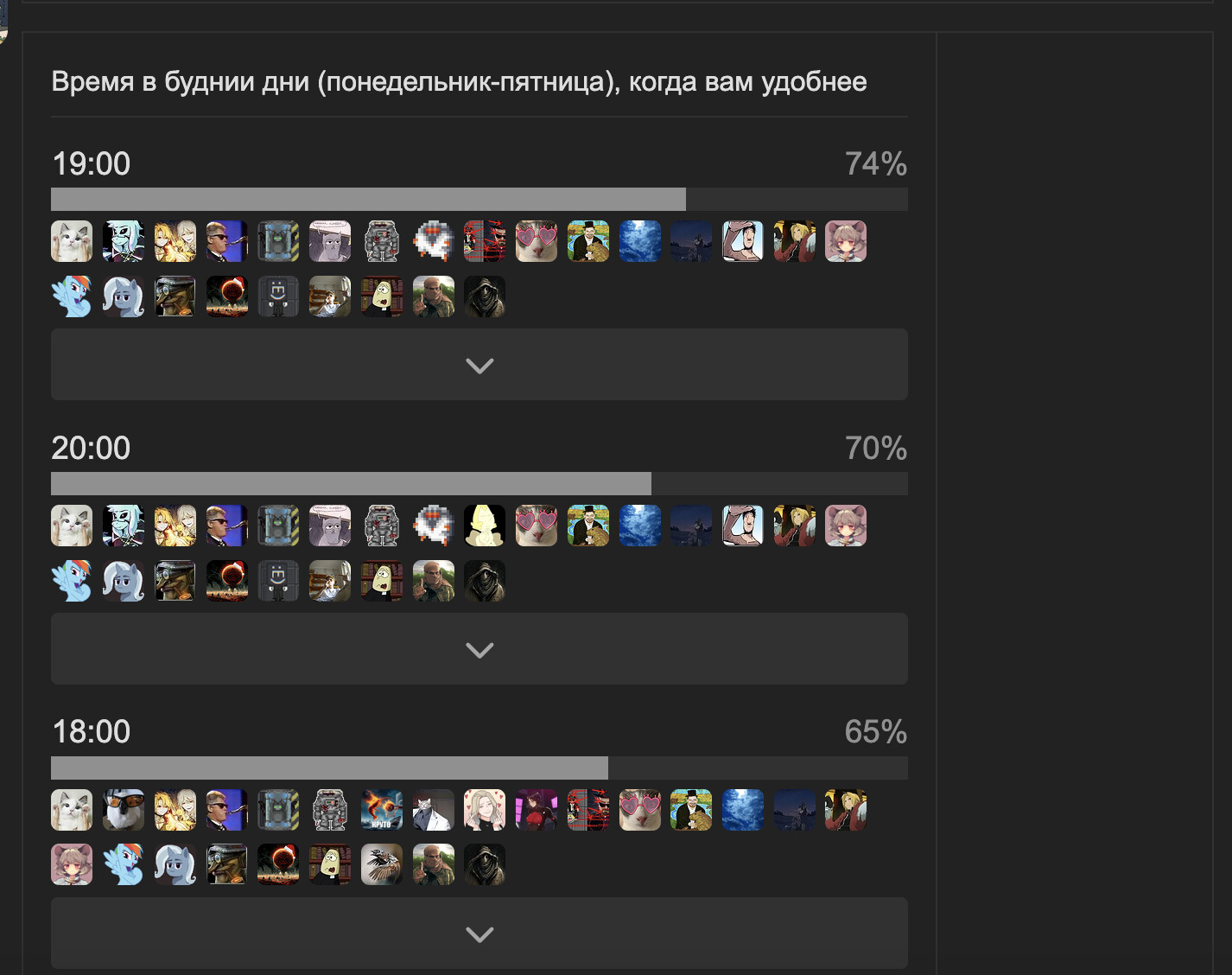 Сборы происходят, имхо, слишком поздно даже в выходные, по итогу людей хватает на 1-2 раунда, а после они отправляются спать.