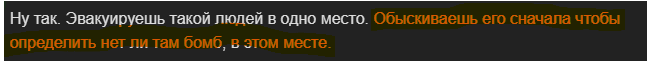 В третьих не организовать эвакуацию населения в одно компактное место чтобы проверить станцию на наличие бомб. И чтобы уже в момент когда все в одном месте удалённом - проверить рюкзак мб там сигналлер. Нет, всем похуй на персонал.