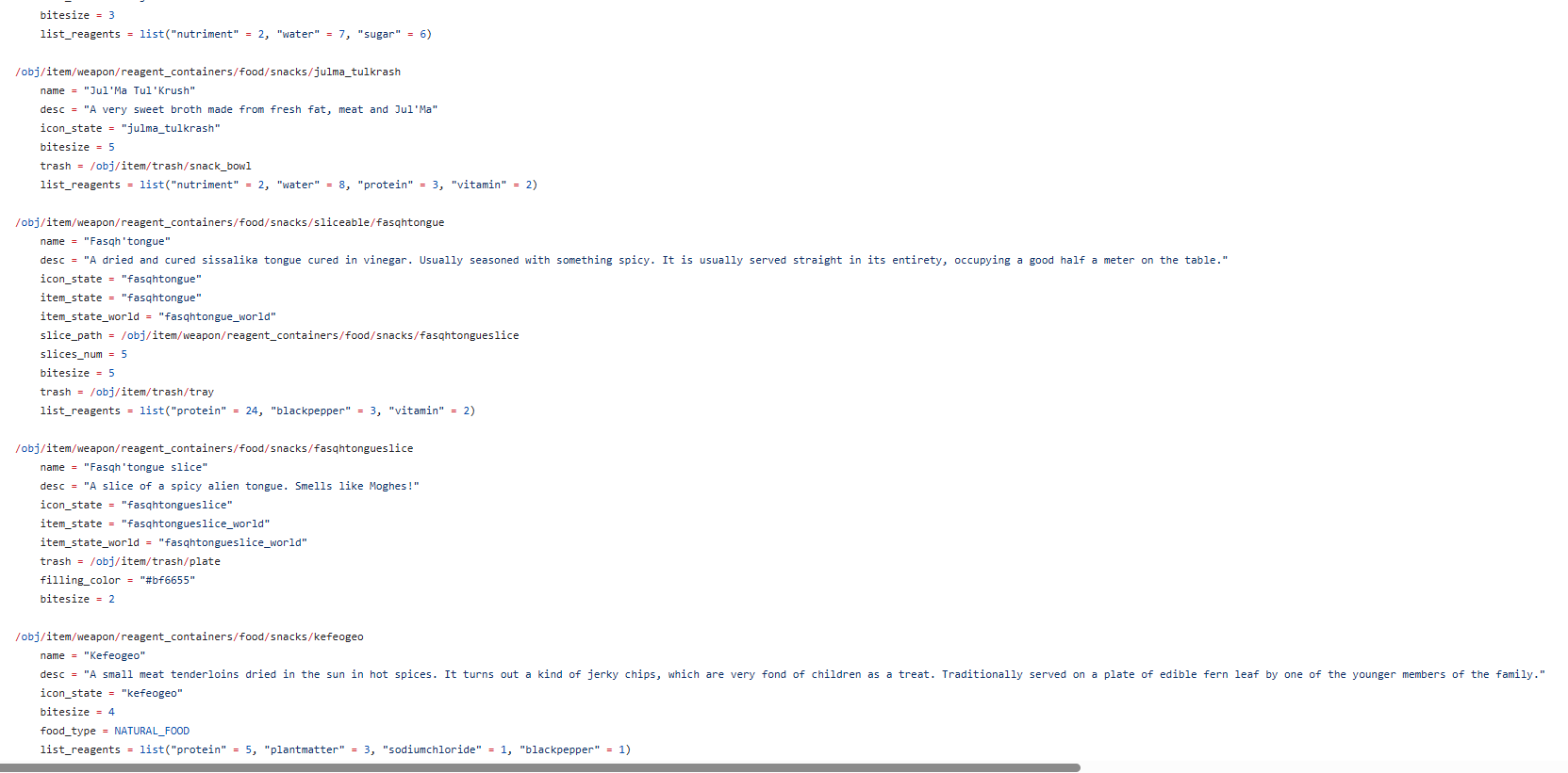 На большее пока не хватило фантазии. Да и на то, чтобы наполнить эти 4 категории фантазии тоже не хватило. Например, из всех “родных систем” свои предметы имеют только могес да адомай, ибо я в душе не чаю какие предметы/еда в билде относятся к каким расам, а какие расы к каким планетам/системам.