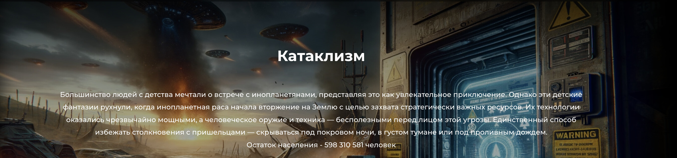 Настало время катаклизма, и человечеству угрожает вымирание. Вам повезло: вы и небольшая группа выживших обнаружили спасительный бункер. Есть проблема: попасть в бункер смогут не все – а лишь половина из вас. Генератор кислорода в бункере рассчитан строго на определённое число человек. Остальные будут обречены встречать катастрофу снаружи.